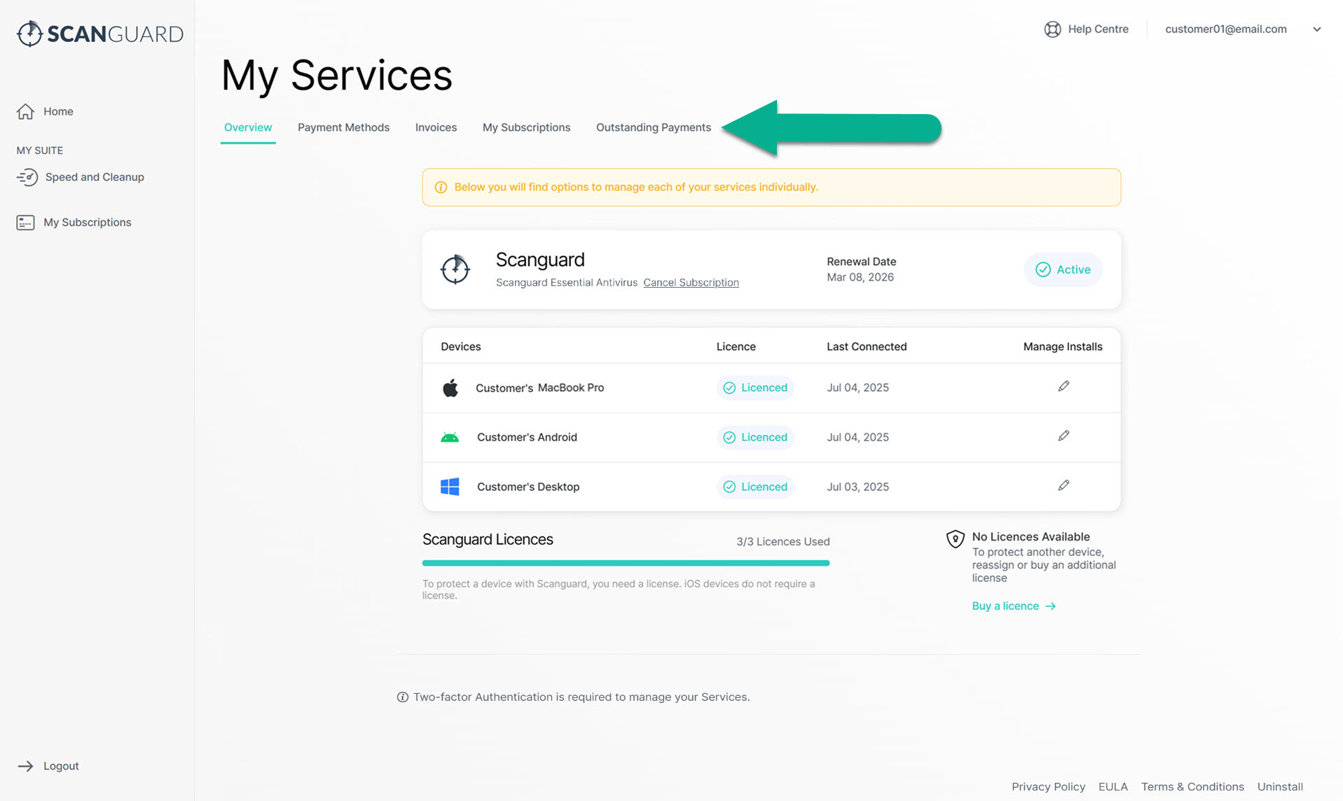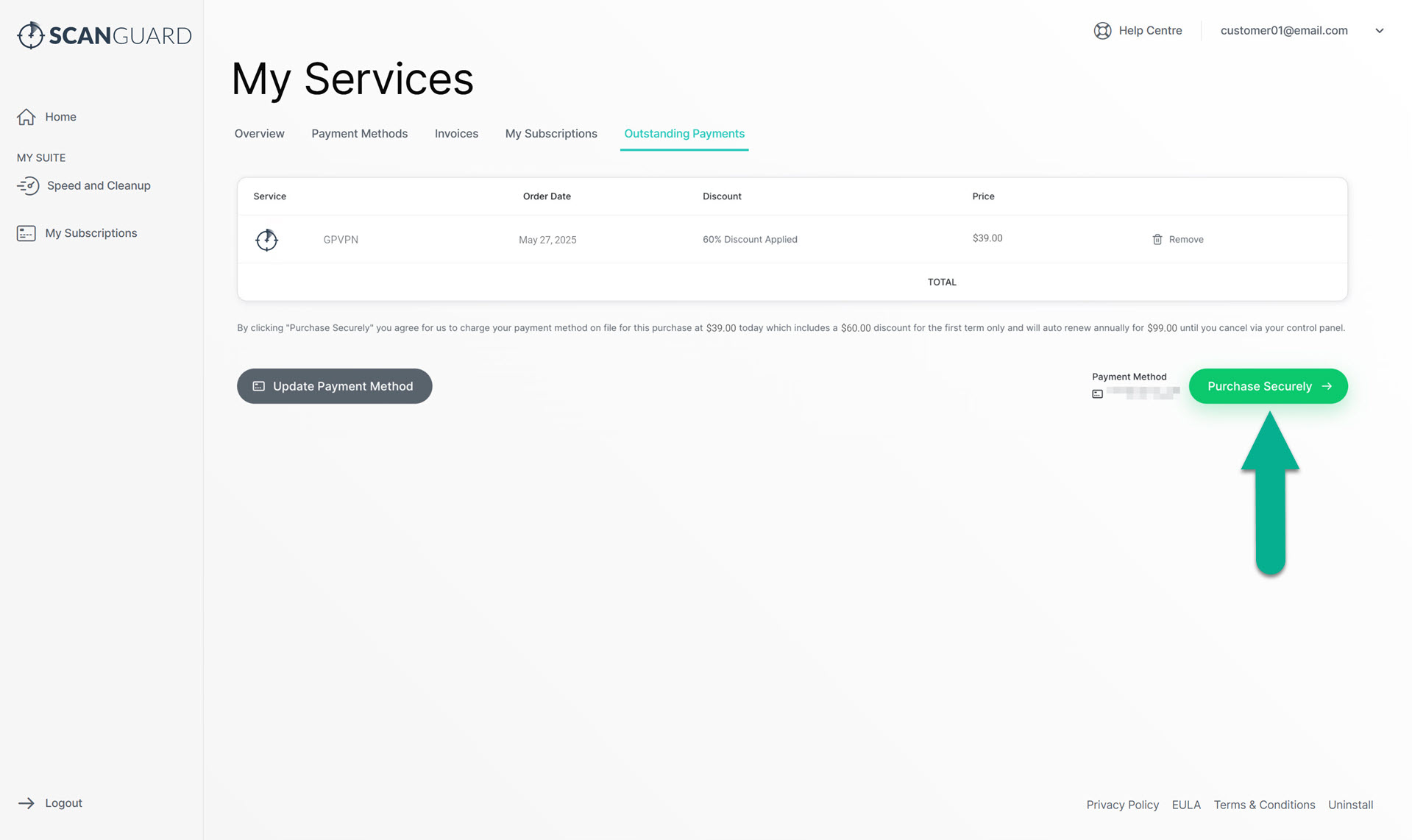 If you have any outstanding payments (like the example below), first ensure your Payment Method is valid and up to date. Once confirmed, select Purchase Securely to complete your payment.